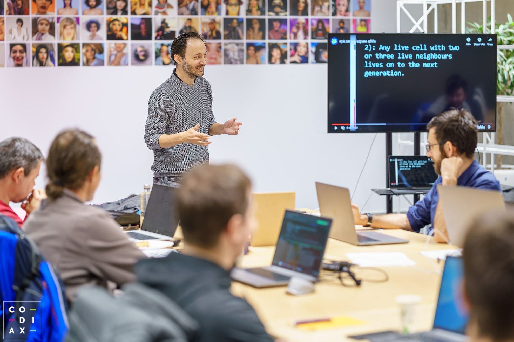 Alin a început ziua de workshop prezentându-le participanților conceptul „Conway’s Game of Life”, o problemă software suficient de complexă pentru a le stârni interesul, dar destul de interactivă pentru a le capta atenția pe tot parcursul lui.