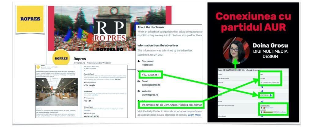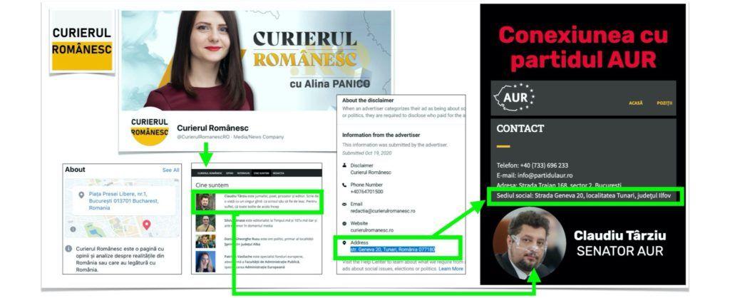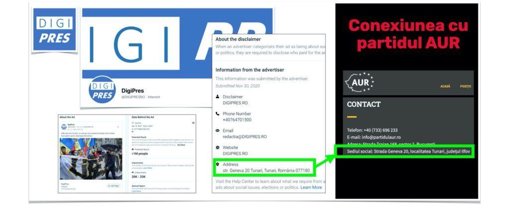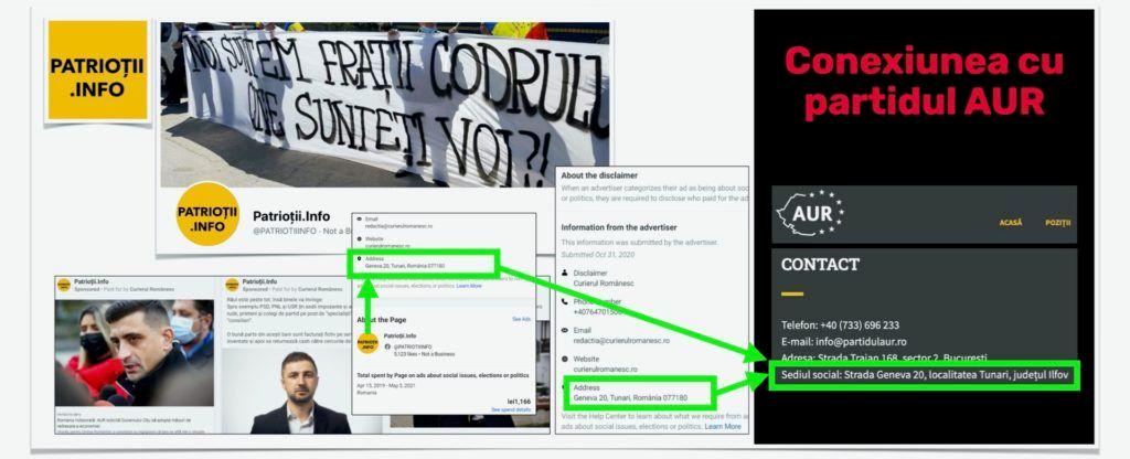 Facebook oferă posibilitatea de a verifica date legate de entitățile care plătesc către Facebook publicitate cu conținut politic. Așa am descoperit că paginile site-urilor Curierul Românesc, DigiPRES și Patriotii.info sunt înregistrate direct la adresa pe care este înregistrat sediul social al AUR, în Tunari, pe strada Geneva.