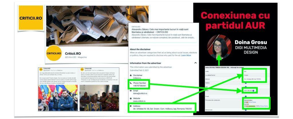 Pagina de Facebook criticii.ro a fost înființată în 26 decembrie, 2020 și se definește ca fiind o revistă cu deviza „Platformă cu critici de înaltă performanță”. Unul din materialele sponsorizate de pagină susține, de pildă, că „USR este o clasă de privilegiați aroganți care îi urăște efectiv pe români și îi iubesc pe străini și măsurile grele care sunt impuse țării”.