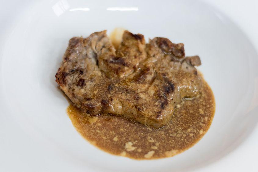 În sosul rămas în tigaie am pus câteva linguri de smântână de lapte de bivoliță. Am amestecat elegant, după care am turnat puțin sos peste carnea din farfurie.