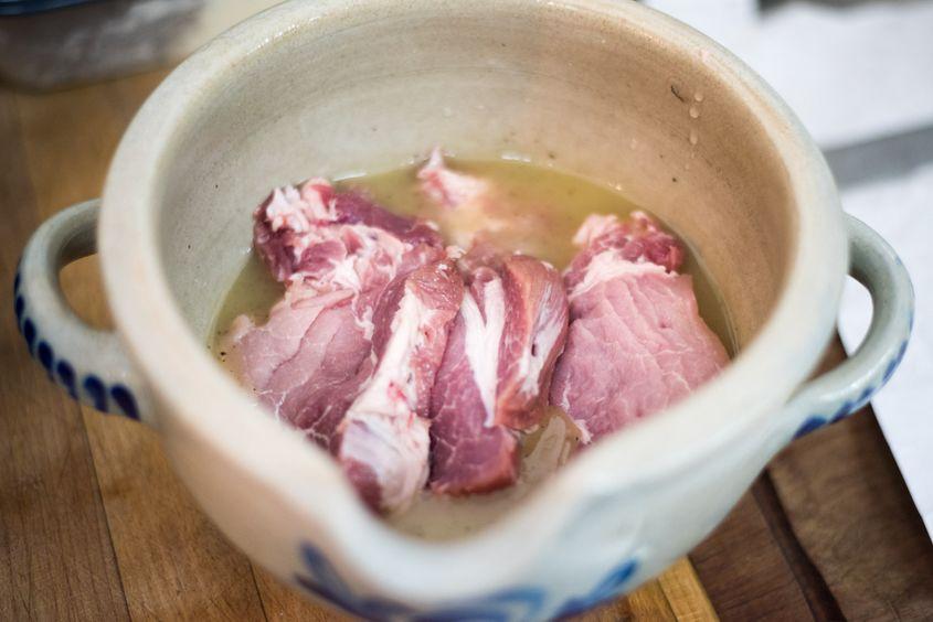 Am amestecat până s-a topit sarea, apoi am luat feliile de carne și le-am pus la „marinat” în oala cu vinegretă. În termeni de specialitate, le-am pus să facă nani (faire dodo) pentru cel puțin 45 de minute.