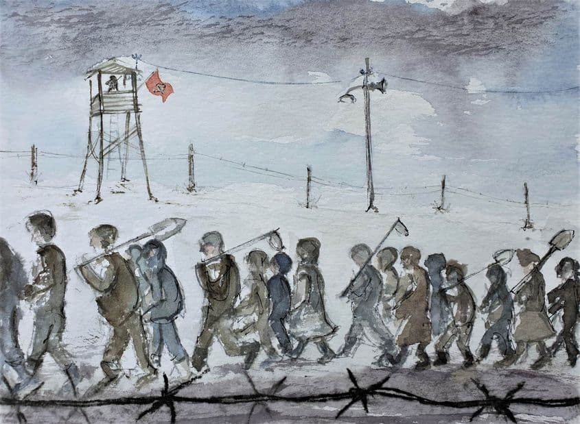 "Vântul ne biciuia obrajii şi ne smulgea hainele de pe noi. Coloana părea fără de sfârşit. Înaintea noastră, rânduri-rânduri de deţinuţi, escortaţi de ambele părţi de gardieni înarmaţi. În spate (când îndrăzneam să ne uităm puţin înapoi, ceea ce era interzis) lunga coloană se întindea hăt-departe, ca un animal preistoric de proporţii uriaşe, cu multe mâini şi picioare, orb, neavând alt scop decât a munci până la extenuare. Mi-au venit atunci în minte străvechii mei strămoşi, sclavii israeliţi din vechime, muncind ca robi pentru a construi uriaşele piramide ale lui Faraon."