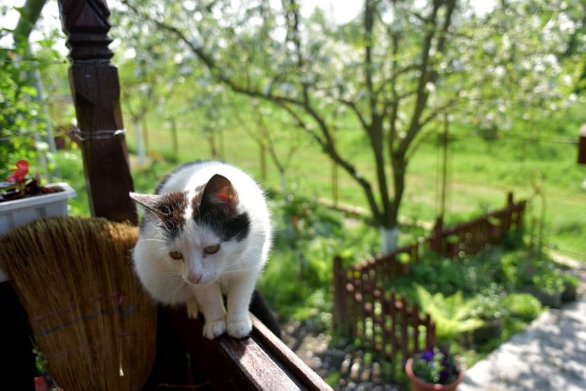 În dreapta văii, o casă se ițește dintre flori. Are o pisică pe prispă și una, mai sperioasă, într-un cireș înflorit.