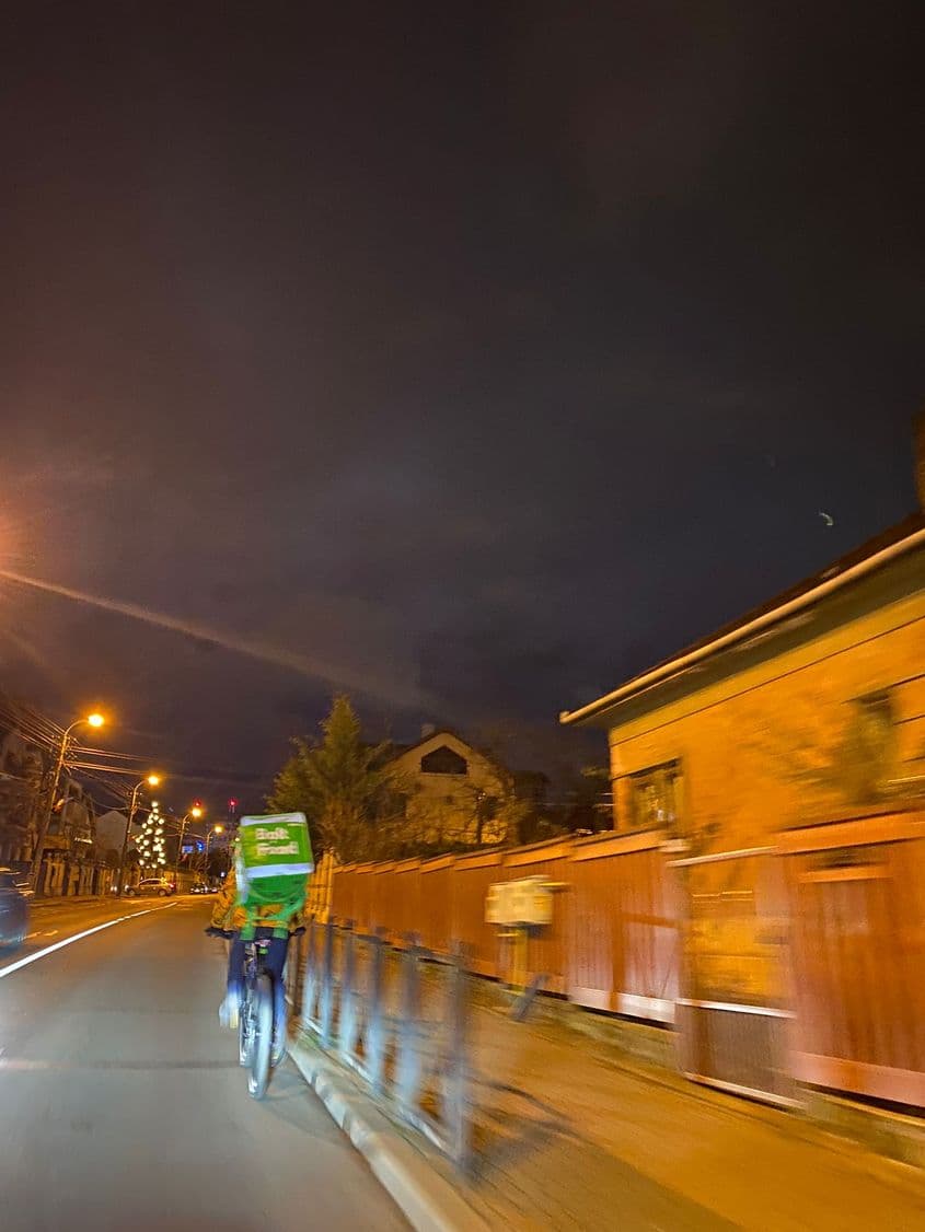 „Zilele trecute am stat până târziu, era trecut de 11 și afară era tare urât, frig de îmi înghețau mâinile pe ghidon și lapoviță de abia mai vedeam în față. Am ajuns la destinația de unde trebuiam să iau comanda, ceva de kebab era. Intru și o dată cu mine intră si puțin din frigul de afară. În momentul ăla, singurul angajat de acolo, un domn la vreo 60 de ani cu barbă albă, dă din cap în timp ce se apropie de mine cu pachetul de mâncare ce trebuia livrat. Ce cauți, omule, pe vremea asta afară?! Atunci mi-am dat seama că nu e român, vorbea destul de greu limba română. Văzusem pe ecusonul din piept un nume de origine turcă. Am dat să ies fără să îi răspund, oricum nu credeam că așteaptă răspuns, dar omul mă trage de braț si mă pune la masă No, no! Stai să te servesc cu ceva te mâncare, stai aici la masă! Mi-a adus un kebab cald care cu siguranță era pregătit de dinainte să ajung eu acolo și s-a pus la masă, iar pentru următoarele 10 minute am stat și am discutat. Omul era tare grijuliu, m-a uns pe suflet, era chiar curios să afle cum îmi e cu bicicleta sau de ce fac asta.”