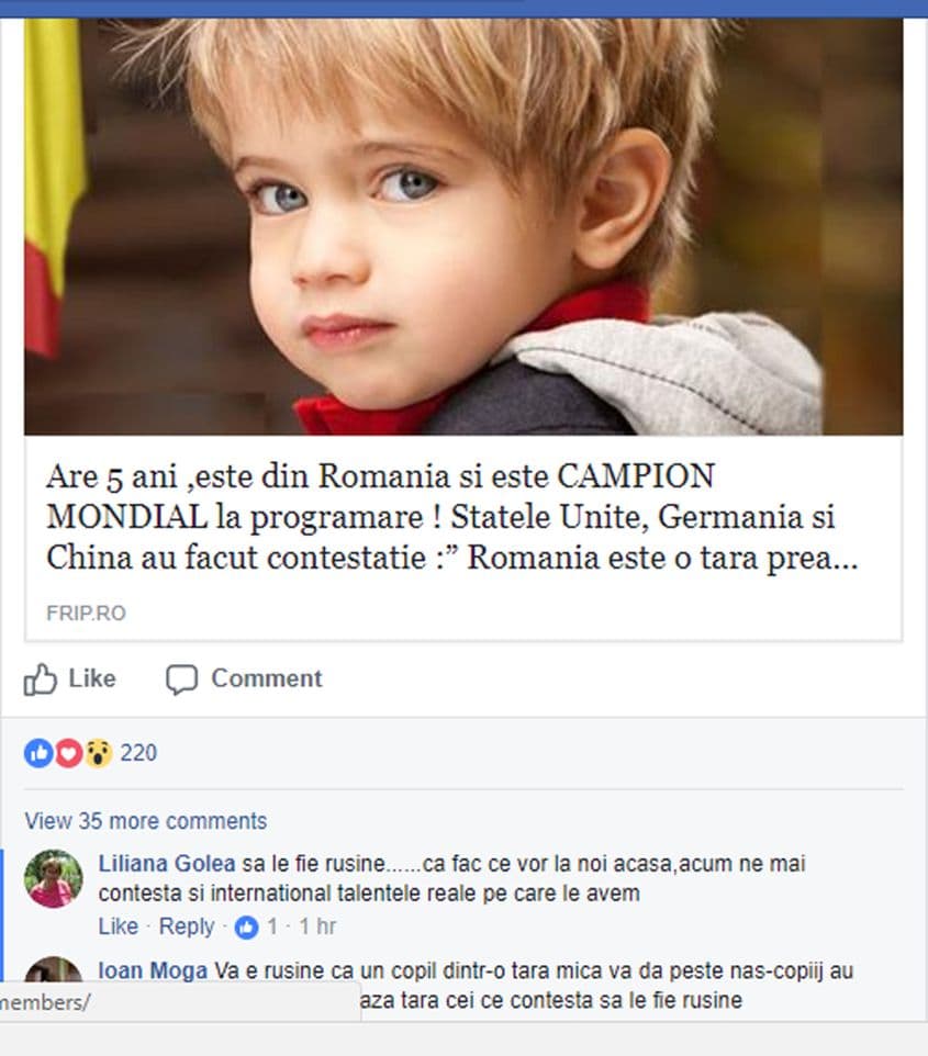 Sunt doar câteva dintre mesajele lăsate la finalul postării despre băiețelul campion. Când vreun comentator le atrage atenția celorlalți că știrea este falsă, este combătut cu argumente de tipul: „Nepotul meu la doi ani a decodificat tableta”…