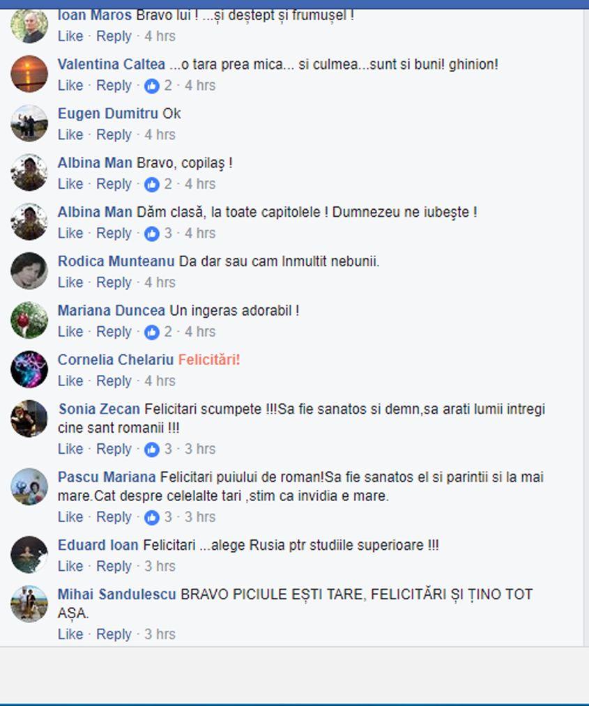 „Felicitări omuleț, și părinților tăi! Dacă alegi sa studiezi în Rusia, vei fi mult mai câștigat! Au o literatură super frumoasă! Felicitări și succes pe mai departe!”