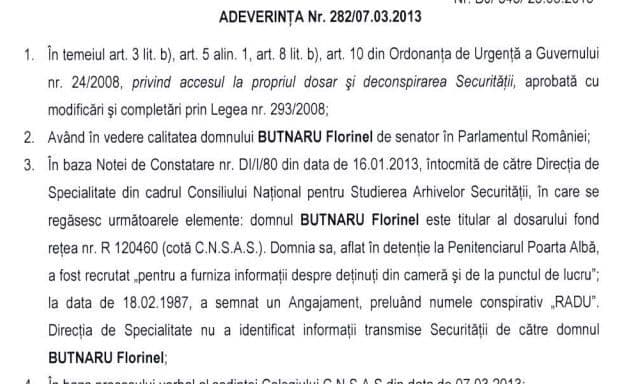 Iată un facsimil din adeverinţa dată publicităţii de CNSAS în 2013: