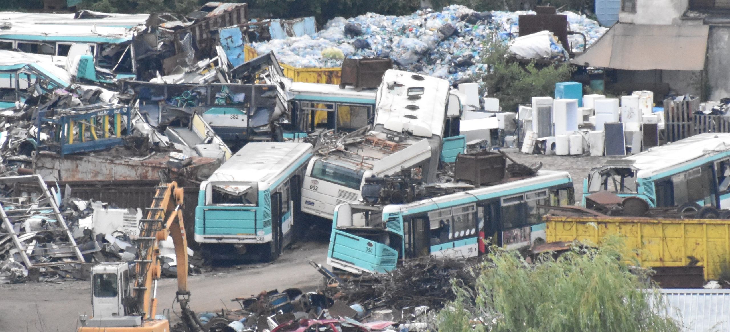 O parte din autovehiculele din parcul CTP Cluj-Napoca, trimise la casat în curtea companiei de colectare de fier vechi, Remat, 2023. Foto: Pagina de Facebook Mobilitate Cluj-Napoca