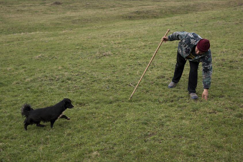 La intrarea în sat, pe un delușor, un om scrutează șoseaua sprijinit într-o ghioagă. În jurul său, vreo 25 de miorițe se bucură de iarba proaspătă. Ne desparte un fel de mlaștină.