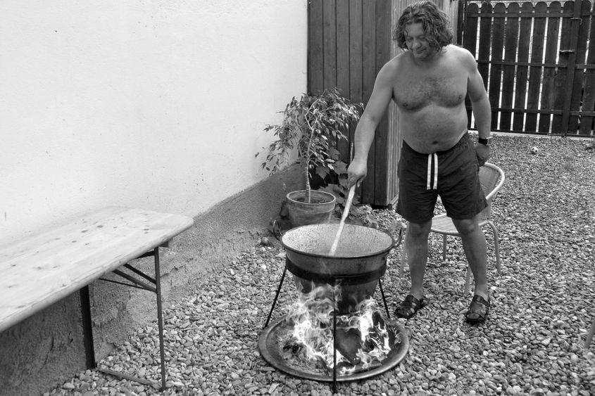 Paul se învârte în jurul ceaunului ca un leu în cuşcă, în timp ce limbile de foc ne pârlesc părul de pe picioare. Ba e focul prea iute, ba Jutka nu vine destul de rapid cu carnea. Au amestecat viţel de lapte, muşchi de porc şi ciolan afumat într-o ordine precisă. E prima dată când găteşte gulaş unguresc fără să bea o bere, două, hai trei.