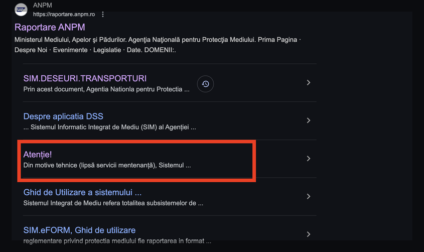 În plus, o problemă majoră care a contribuit la proasta funcționare a sistemului a fost reprezentată de lipsa fondurilor alocate pentru lucrări de mentenanță. Aspect validat și de mesajul primit de Roxana în urma încercărilor multiple de a se înregistra în site, dar și de avertismentul care apare atunci când cauți pe Google „raportare ANPM.”