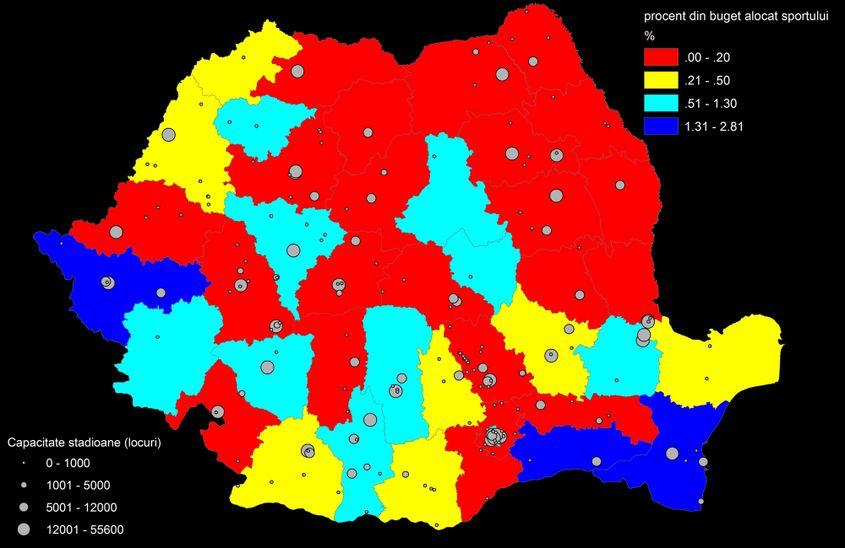 Apoi au corelat distribuția pe hartă cu procente din bugetele județene atribuite sportului. La acest capitol conduc Constanța, Timiș și Călărași.