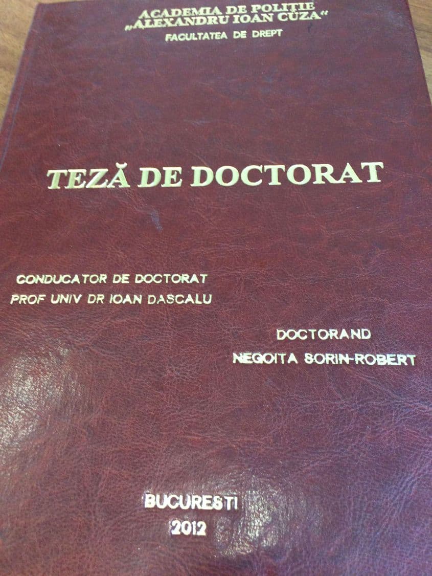 Robert Negoiţă (44 de ani) a devenit doctor în Ştiinţe Juridice în 2012, la Academia de Poliţie „Alexandru Ioan Cuza”. Teza i-a fost coordonată de prof. univ. dr. Ioan Dascălu, care e conducător de doctorat asociat la Academia de Poliţie şi a fost decan al Facultăţii de Drept de la Universitatea Bioterra.