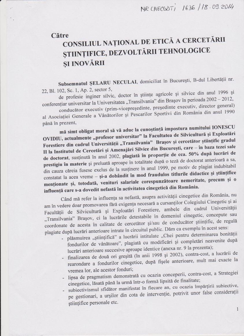 „Mă simt obligat moral să vă aduc la cunoștință impostura numitului Ionescu Ovidiu, actualmente profesor universitar la Facultatea de Silvicultură și Exploatări Forestiere din cadrul Universității Transilvania Brașov și cercetător științific gradul II la Institututul de Cercetări și Amenajări Silvice din București, care – în baza tezei sale de doctorat, susținută în anul 2002, plagiată în proporție de 50% după lucrări de prestigiu în materie și preluată aproape în totalitate după o teză de doctorat anterioară a sa, din cauza căreia fusese exclus de la susținere în anul 1999, pe motiv de plagiat indubitabil constatat la acea vreme – și-a dobândit în mod fraudulos titlurile didactice și științifice menționate și totodată, venituri salariale corespunzătoare nemeritate, precum și o influență care s-a dovedit nefastă în activitatea cinegetică din România.”