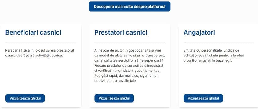 Fiecare categorie de persoane dintre cele trei menționate anterior (beneficiar, prestator sau angajator) poate accesa câte un ghid adaptat poziției din care solicită voucherele casnice, respectiv prestator, beneficiar sau angajator.