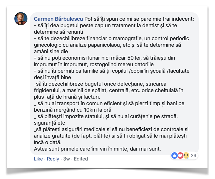 „Nu-și dau seama că fac eforturi supraomenești ca să trăiască cât de cât decent cu foarte puțini bani. Fac rabat la tot. Se taie, direct, întregi capitole.