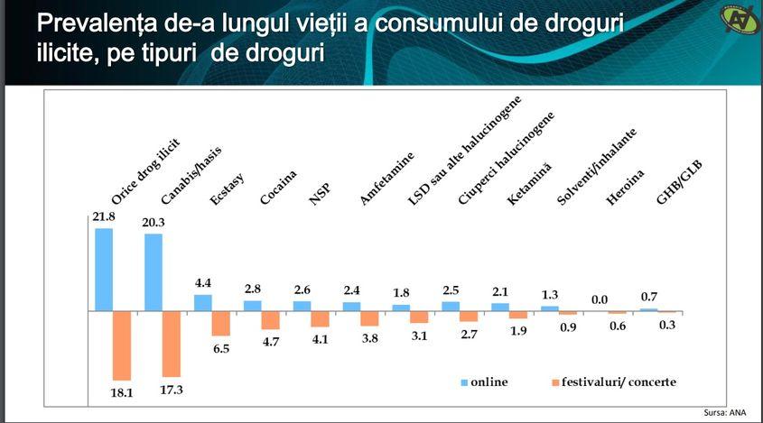 Cel mai recent studiu al Agenției Naționale Antidrog arată o creștere a consumului de droguri în România, mai ales pe segmentul de vârstă 15-34 de ani. Cel puțin doi din zece tineri cu vârste cuprinse în acest interval declară că au consumat cel puțin o dată un drog ilicit.