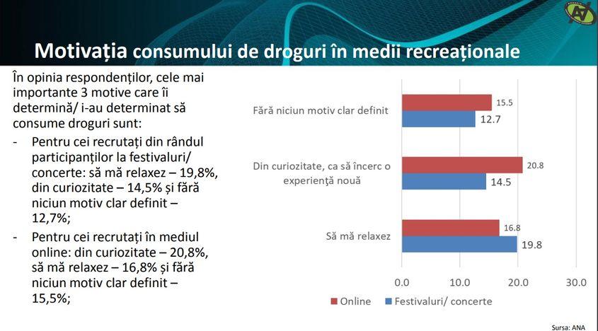 Motivațiile lor diferă, dar, susține ANA, o bună parte din fenomen ar gravita în jurul concertelor, festivalurilor de muzică sau cluburilor și barurilor. Agenția merge până la genurile muzicale în sine și constată, de exemplu, că tinerii care se droghează preferă muzica house, pop, reggae și rock. O informație a cărei relevanță sau utilitate par greu de înțeles.