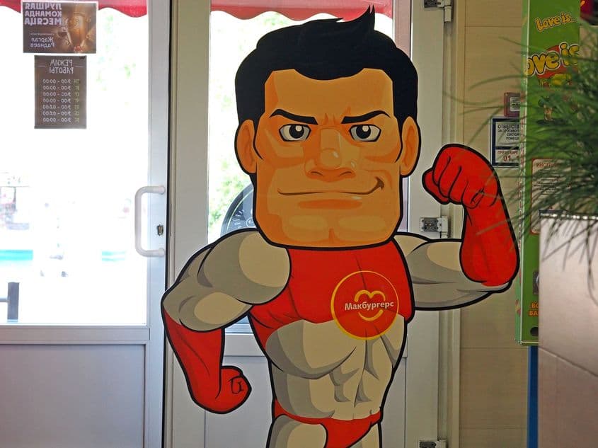 Băieții noștri se sparg de râs și se pozează cu Macburger, mascota-replică a clovnului Ronald. Doar că ăsta are un aer macho, moț, chiloți de Superman și o figură hotărât-impersonal-încrezătoare, din ale cărui trăsături răsare o combinație de Lenin-Brejnev-Putin.