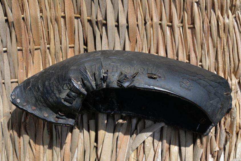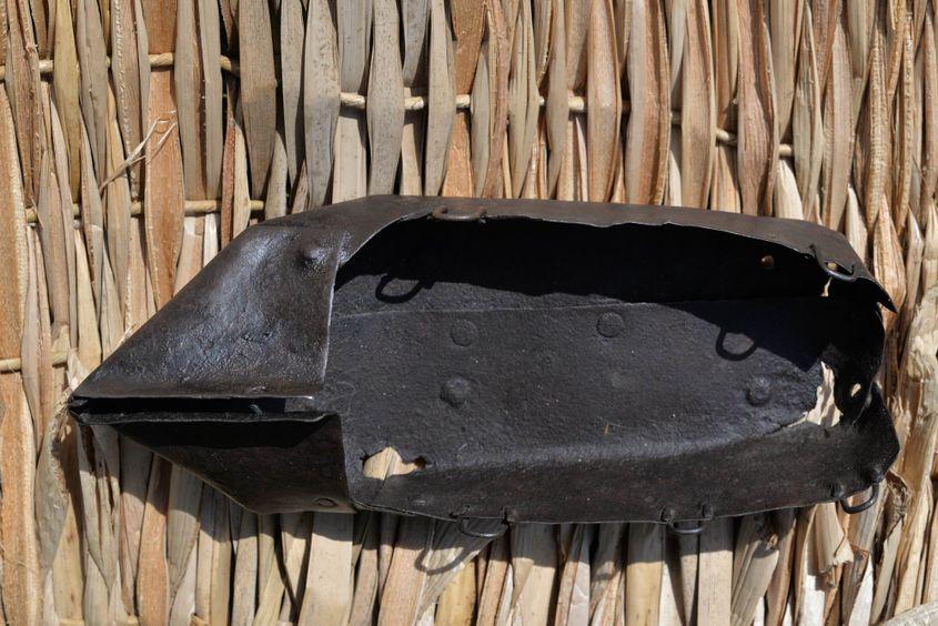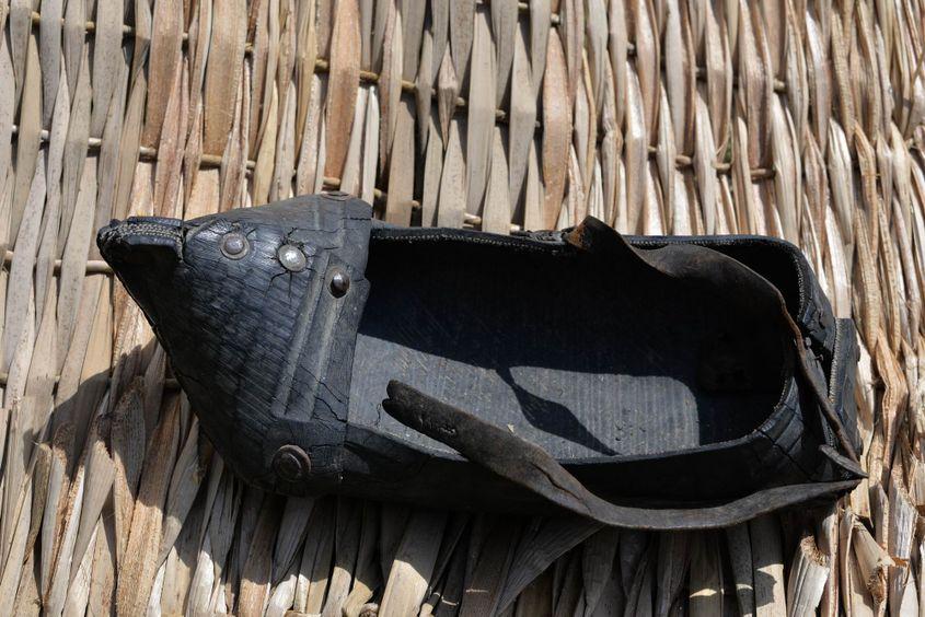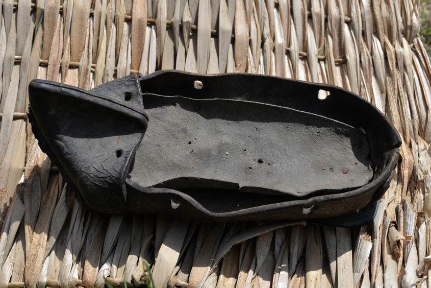 Nu aveau aparat de sudură, lipeau prin nituire. Unde s-a uzat, i-a pus un petic tot din tablă, și l-a nituit. Opinca asta a fost purtată de nevasta fierarului.