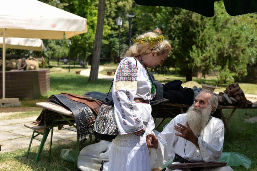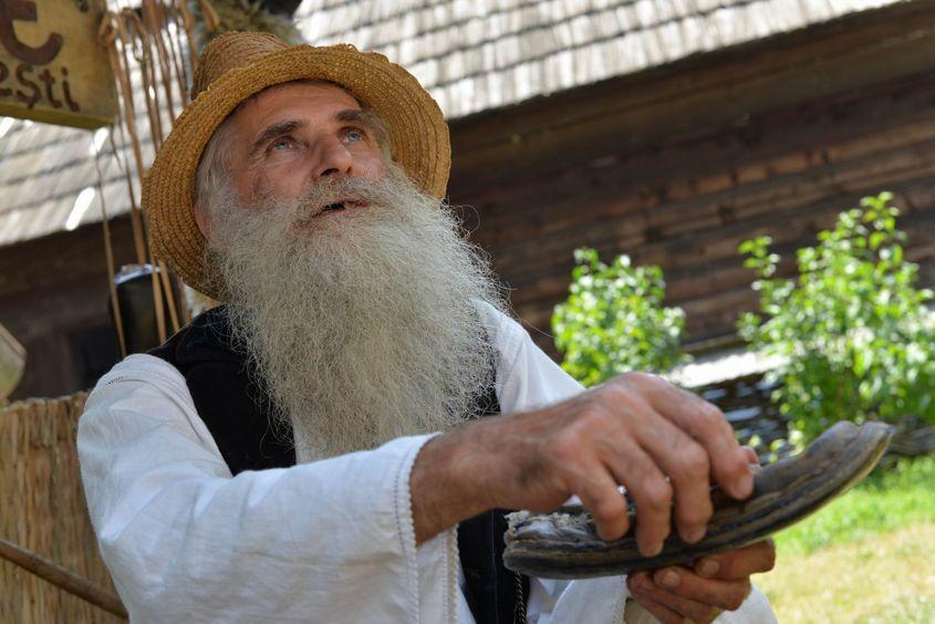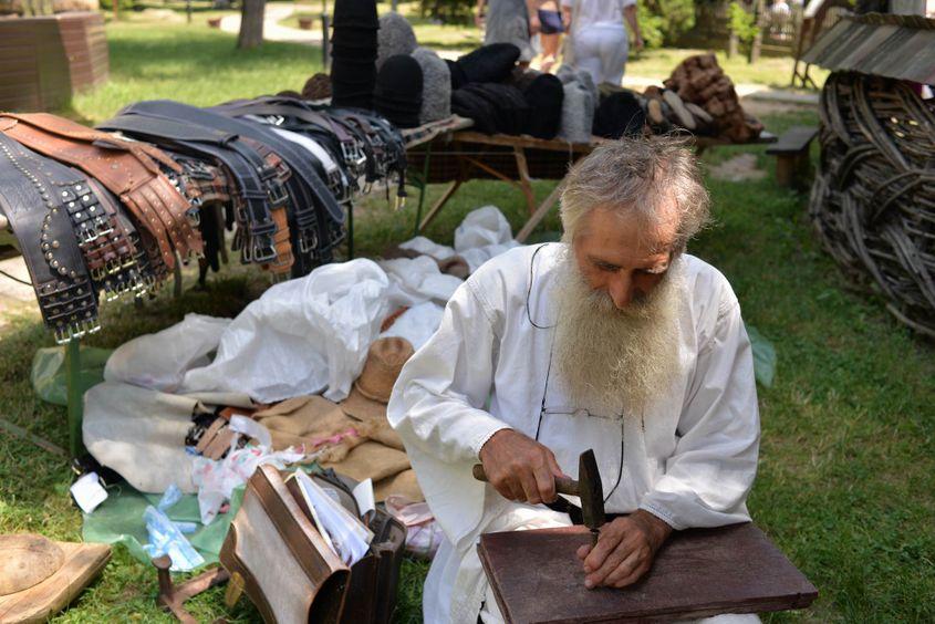 E soare dogoritor în această zi de Sânziene și, pe o alee de la Muzeul Satului din București, în spatele unei tarabe cu căciuli de astrahan, opinci și cingători de piele, un meșter cu barbă albă de eremit își așteaptă clienții.