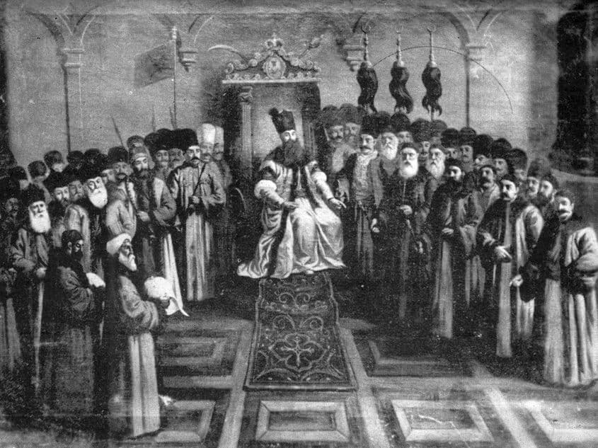 "Când veni rândul turcilor se lăsă liniștea. Trimișii împărătești, ceaușii, iamagiii, mataragiii și Marele Ciohodar, cu oamenii lui, aveau caii complet îmbrăcați în capoate de mătase, cu flori verzi, iar copitele erau vopsite în culoarea racilor fierți. Turbanele țineau fesuri înalte, ale căror funduri abia ieșeau din cearceaf. Pe lângă trimișii sultanului, copiii cădelnițau cu parfumuri ușoare, încât abia un abur se ridica din când în când. Podul lui Lascăr se umplu de mirosuri, în special de smirnă și mosc."