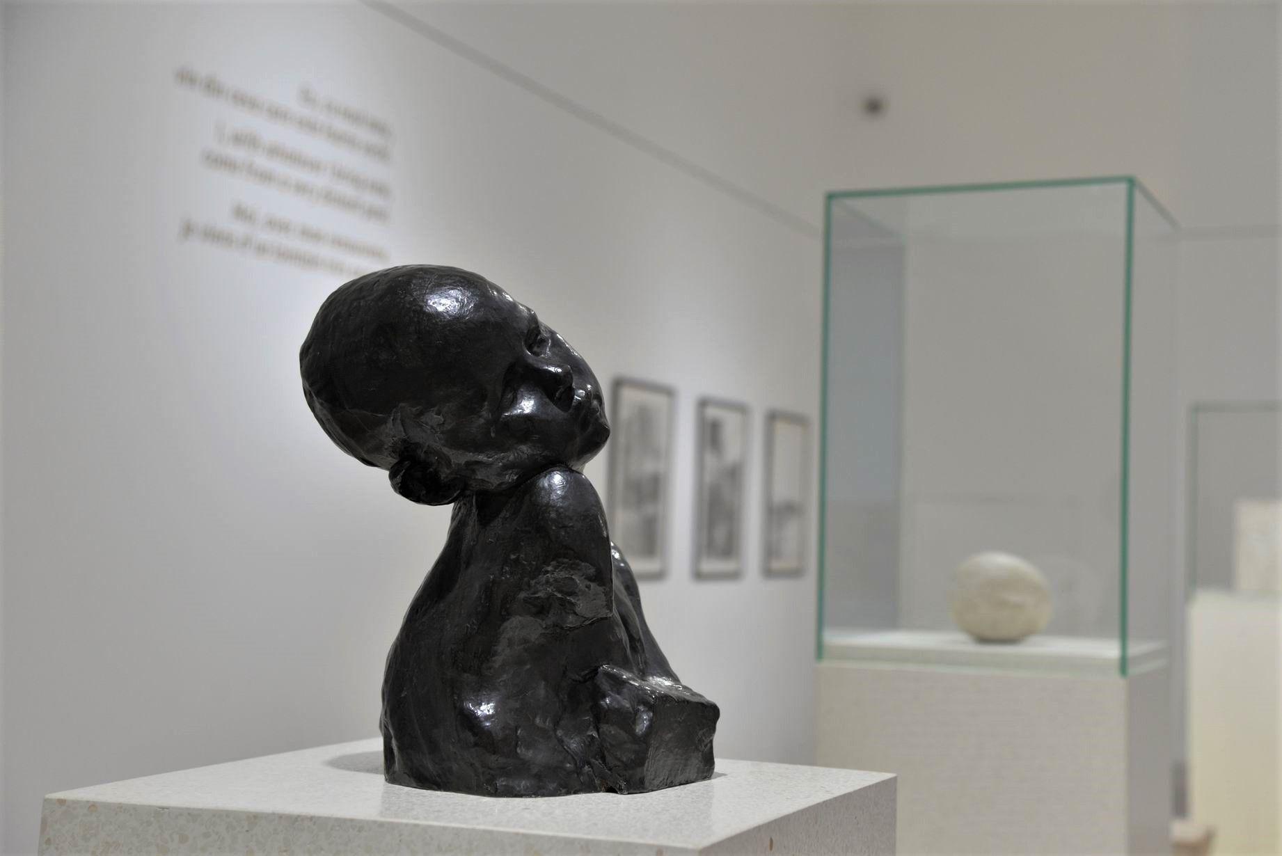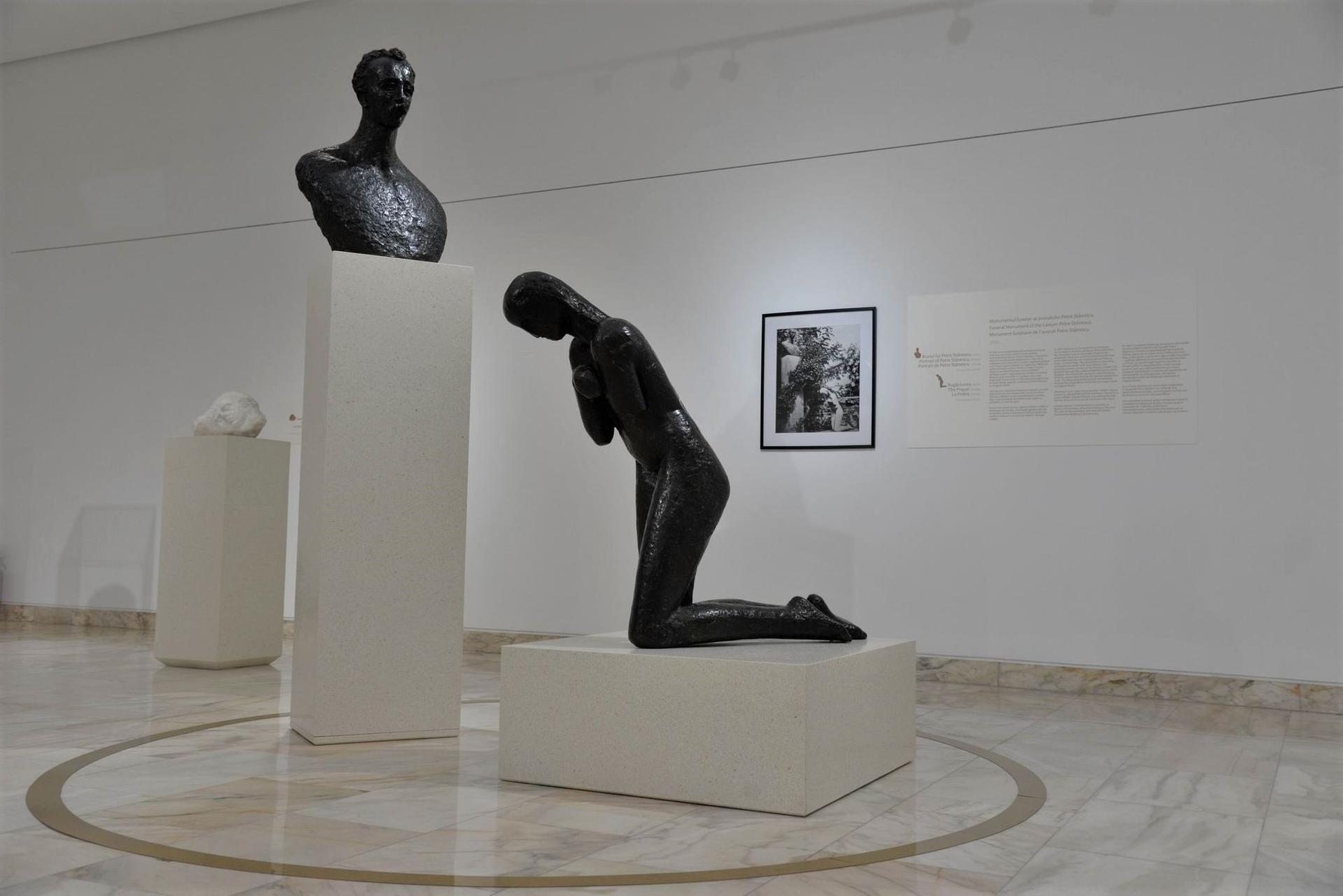 Frumoasele sculpturi în bronz sunt flancate pe pereți de un delicat desen în tuș pe hârtie, un nud, schiță din ghips pentru portretul lui Carol Davila, dar și de fotografii alb negru cu Brâncuși în atelier.