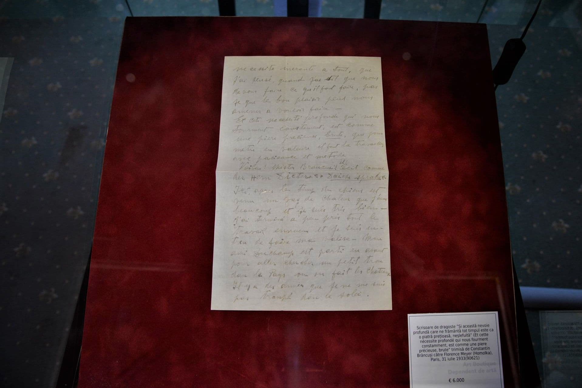 În sediul casei de licitații, în expoziția de la etaj aveți parte de o surpriză: o scrisoare de dragoste scrisă de Constantin Brâncuși către Florence Meyer, datată 31 iulie 1933, Paris. E emoționant să vezi acea fragilă coală de hârtie pe care se poate citi scrisul de mână al lui Brâncuși. Cerneala s-a estompat odată cu trecerea timpului, dar caligrafia își păstrează frumusețea și fermitatea.