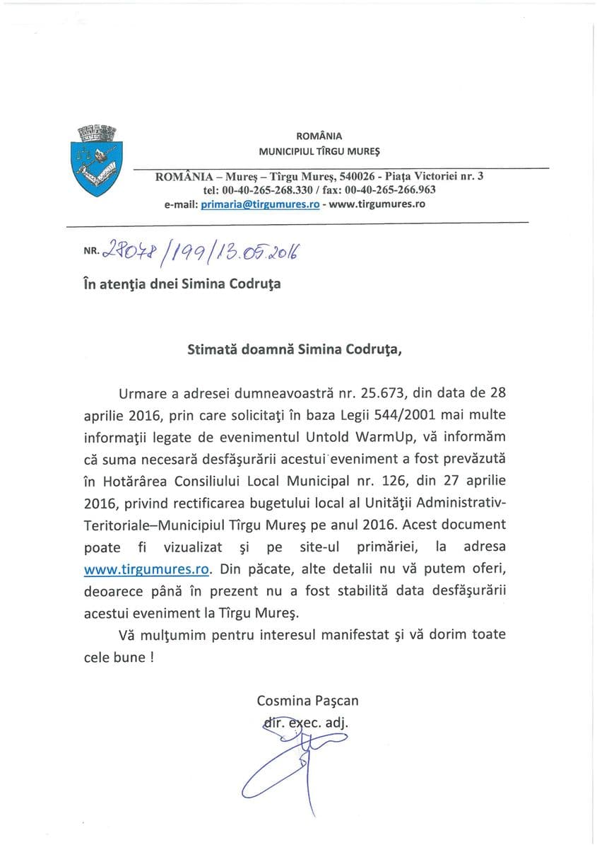 Am solicitat Primăriei Târgu Mureș să ne transmită cine a solicitat aceste fonduri, cine organizează Untold WarmUp și în ce constă această manifestare.