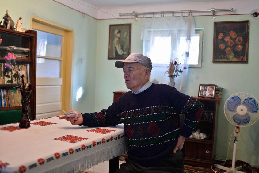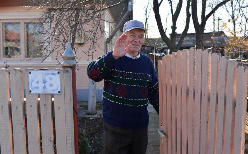 În spatele Primăriei din Căzănești, pe o alee neasfaltată, se află gospodăria lui Cezar Ciobanu (foto), profesor de matematică ajuns la 84 de ani.