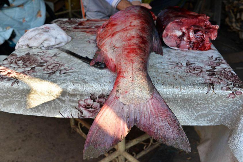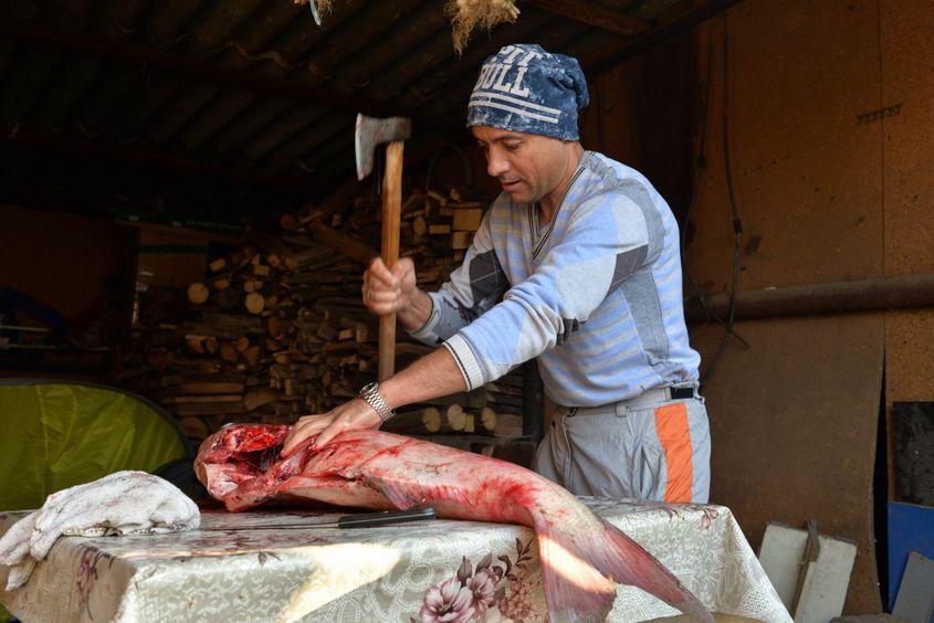 O masă învelită cu mușama este acoperită de un pește imens. Ne minunăm de dimensiunile lui, iar proprietarul, care se pregătește să-l eviscereze, ne lămurește: