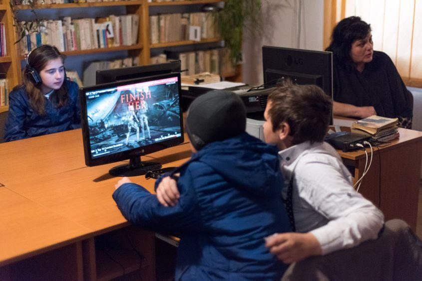 Se poate observa foarte ușor. Lângă rafturile cu cărți sunt și patru calculatoare. Două fete și doi băieți, de 10-11 ani, navighează pe internet.