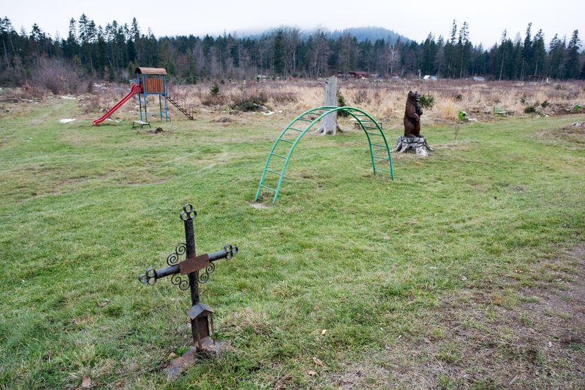 În fostul parc balnear, atmosfera este înfricoșătoare. Buruienile crescute în voie înconjoară un monument dedicat soldaților ruși căzuți în al Doilea Război Mondial.