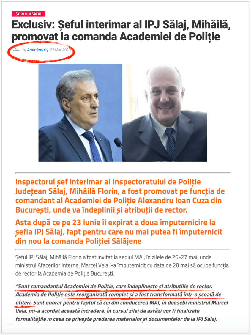 Vinerea trecută, când ordinul de ministru a intrat în vigoare, Mihăilă își încheiase de doar o zi mandatul de șef interimar al Inspectoratului de Poliție al Județului (IPJ) Sălaj - unde fusese împuternicit de două ori succesiv, pentru câte trei luni, de același Marcel Vela.