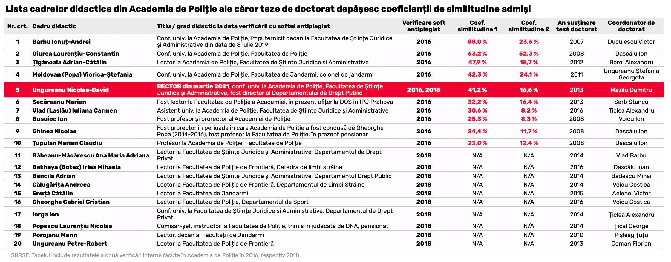 E drept că în cazul rectorului David Ungureanu nu există încă un verdict din partea CNATDCU pentru niciuna dintre cele două teze de doctorat ale acestuia, însă funcția de rector este cea mai vizibilă poziție dintr-o universitate, iar în cazul lui Ungureanu suspiciunea vizează nu una, ci ambele lucrări științifice ale acestuia, după cum am arătat în martie în investigația „Urgia la Academia de Poliție (XII): Un rector. Două doctorate. Două plagiate”.