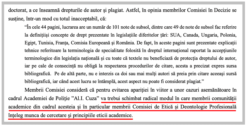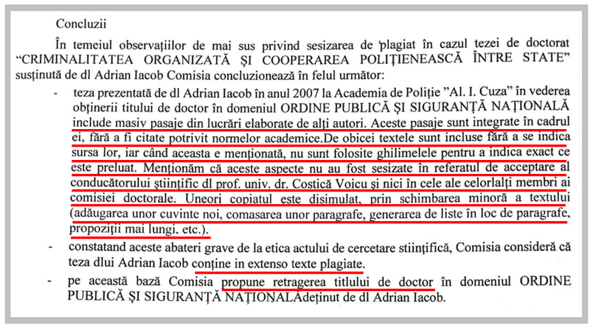 În legătură cu aceste pagini, Comisia de lucru atrage atenția asupra deciziei emise de Comisia de Etică și Deontologie Profesională a Academiei de Poliție care, prin decizia de menținere a titlului de doctor pentru Adrian Iacob, dă dovadă de „o gravă neînțelegere a caracterului muncii academice de doctorat, a ce înseamnă drepturile de autor și plagiat”.