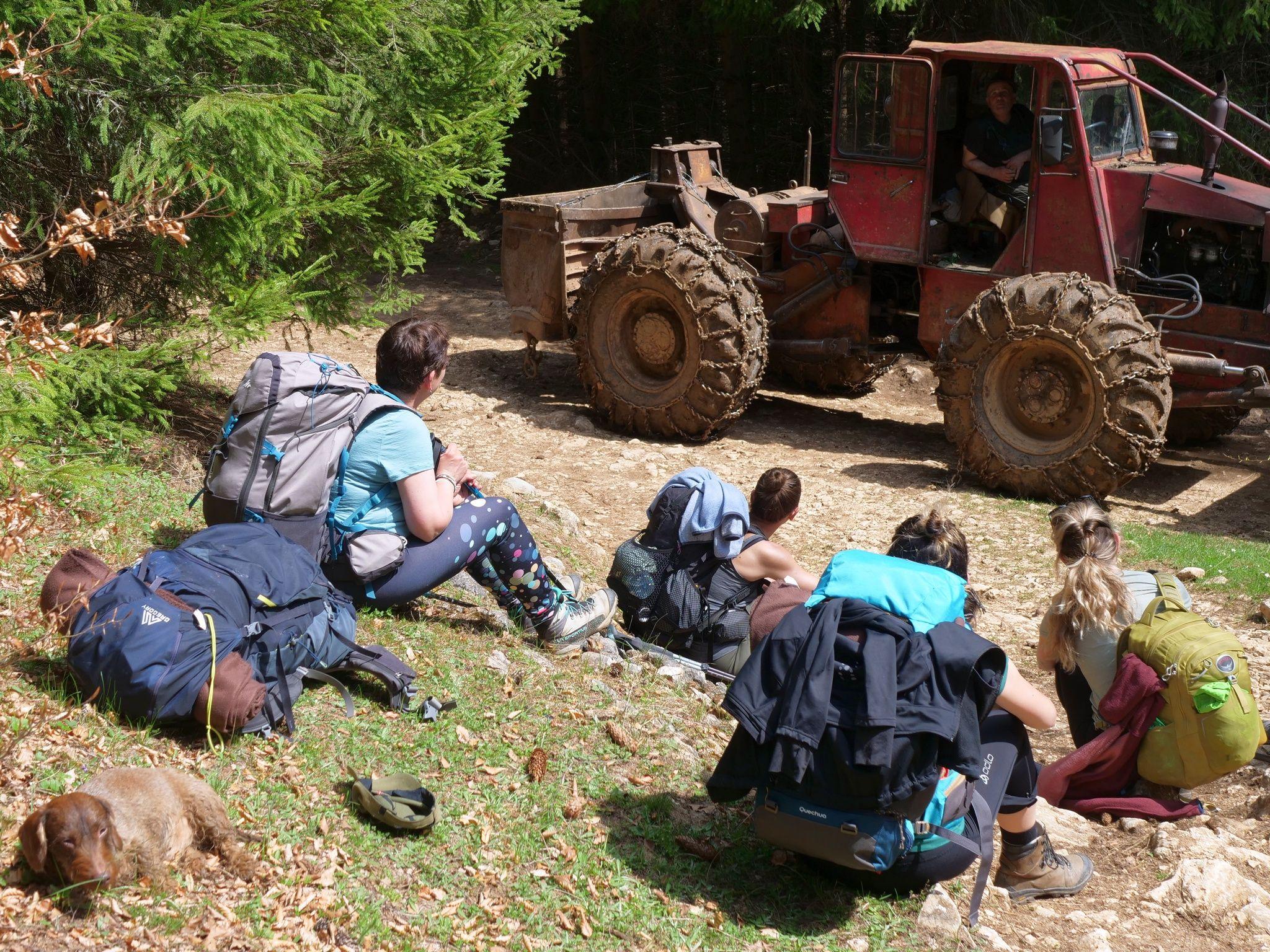 După vreun ceas de mers printr-o pădure de fag, ne dăm seama că ne urmărește un TAF, cu lanțuri mari la roți. E primul astfel de utilaj care vrea să vorbească cu noi, nu să tragă lemne, cel puțin deocamdată. Șoferul oprește motorul, fetele lasă poverile jos și, așezate ca la teatru, ascultă o poveste de viață tipică unui om de munte, livrată sincer și rapid, începând din copilărie și terminând cu momentul vorbirii. Parcă am mai auzit povestea asta, spusă cu mici nuanțe altfel, altundeva, dar tot în România profundă.