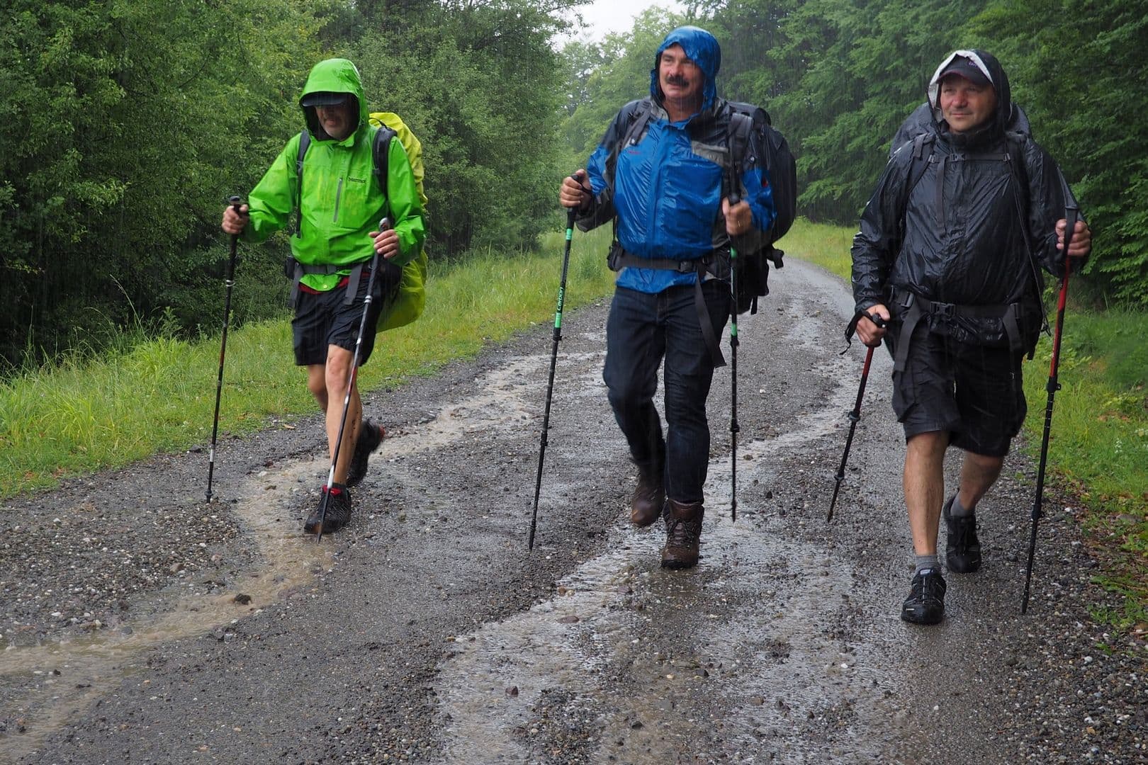 Nu ne revenim din mirare prea bine și ne face praf o torențială. Ca să ne protejăm un pic, umblăm prin pădure, paralel cu drumul, până dăm nas în nas cu cinci câini mari, de stână, care stau și ei de ploaie.
