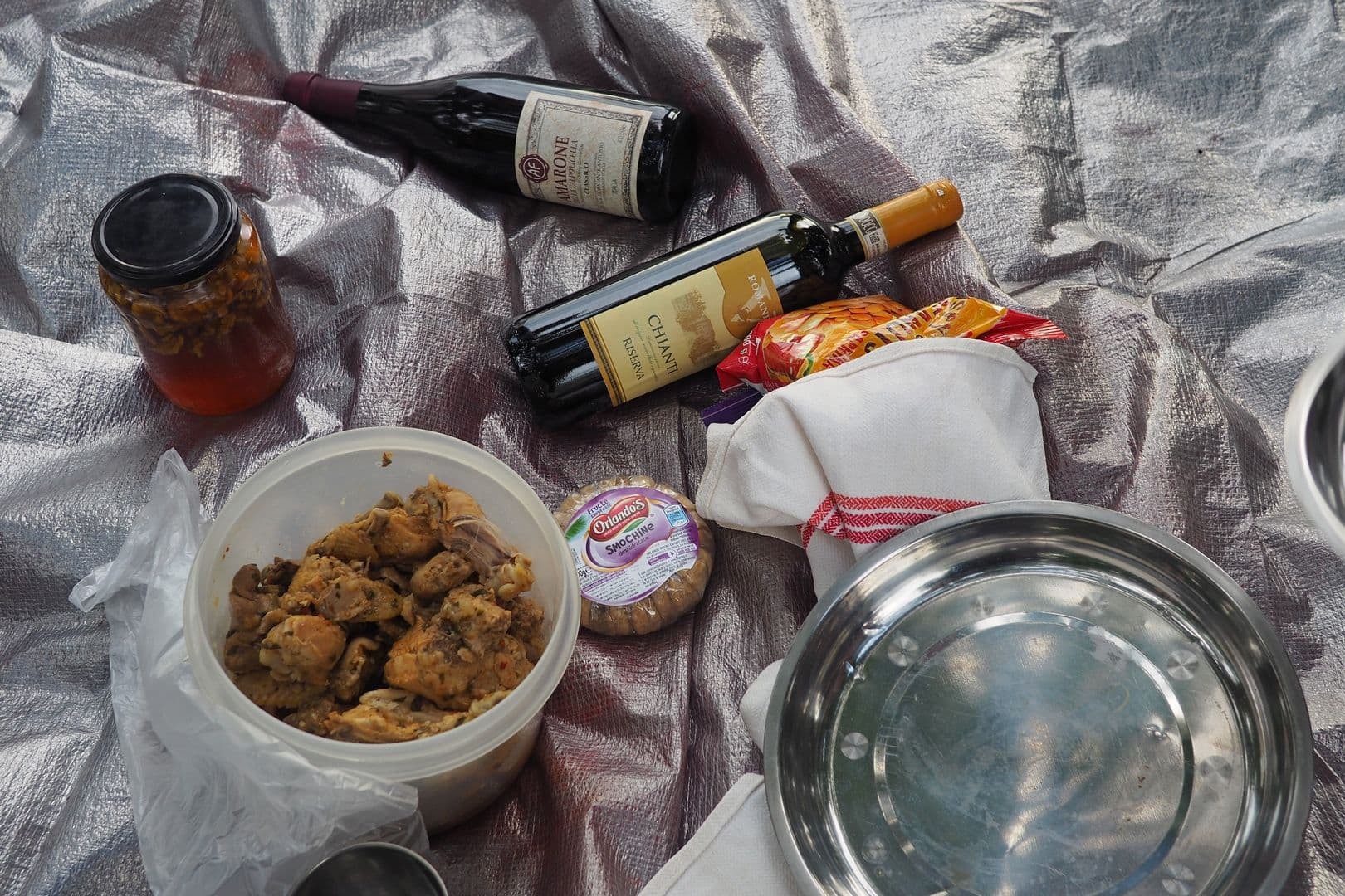 Deasupra capetelor noastre, norii se adună la greu, dar noi bem vin Chianti și nu vorbim despre viață, ci o trăim savurând fiecare secundă. Apoi cade brusc potopul, înainte să fi apucat să întindem corturile. O facem într-o stare de panică euforică, uzi ca niște găini.