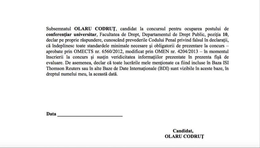 La finalul fișei de autoevaluare, Codruț Olaru a completat o declarație pe proprie răspundere prin care certifică, în fals, faptul că îndeplinea standardele minimale necesare și obligatorii.