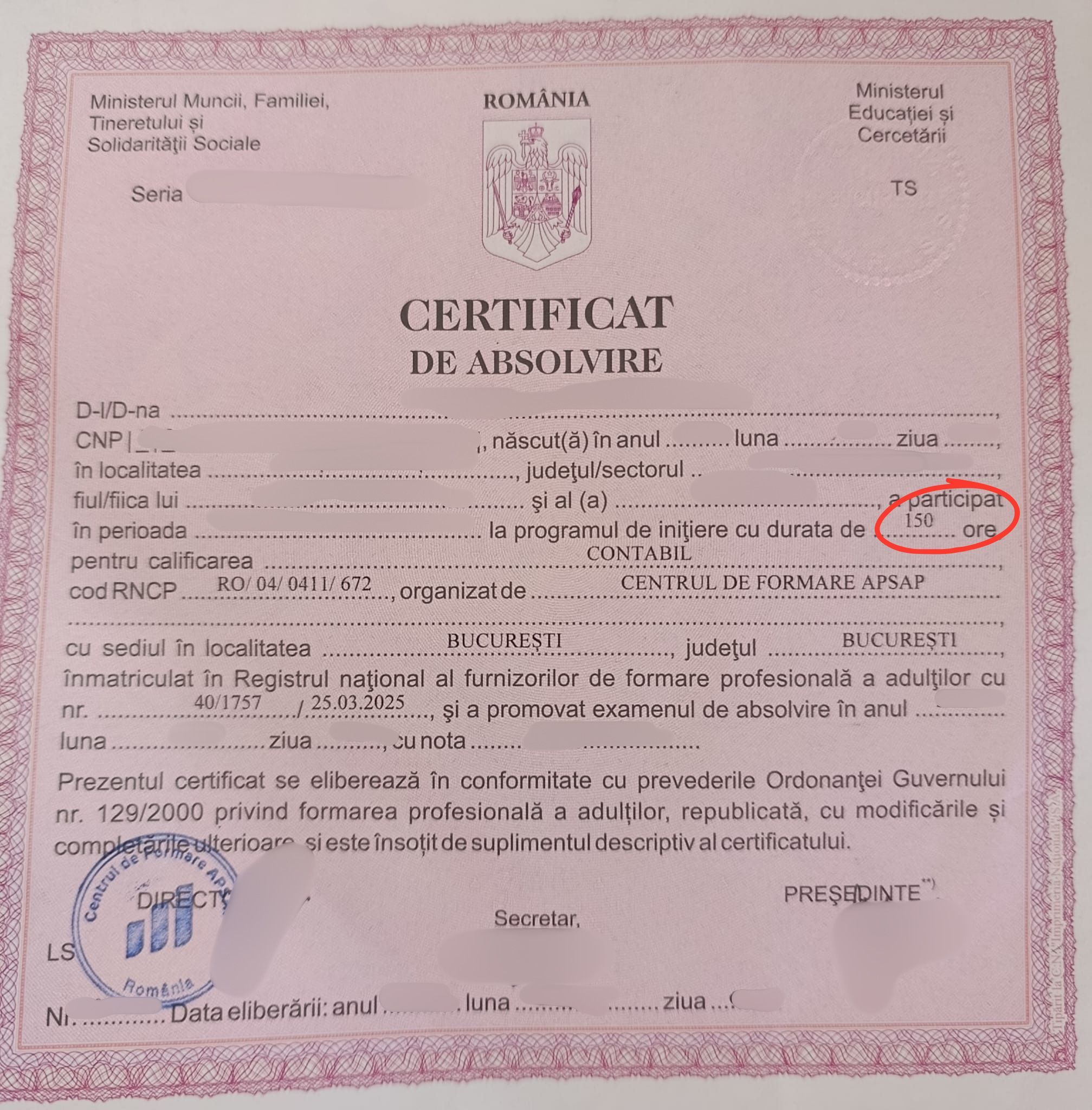 Certificatul de absolvire eliberat absolvenților APSAP, care menționează 150 de ore de pregătire pentru calificarea "contabil"