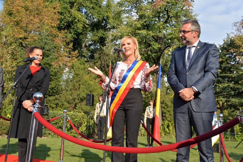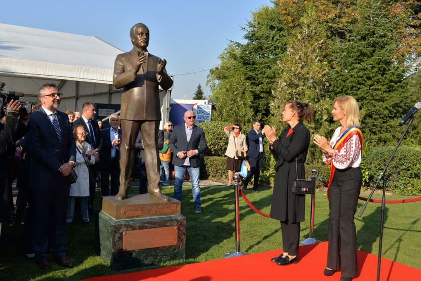 Dezvelirea statuii Prințului Rainier al III-lea de Monaco în Parcul Circului din București. Operațiune executată de primarul general Gabriela Firea (în ie), ministrul Culturii, Lucian Romașcanu (în stânga), și principesa Stéphanie de Monaco (în negru). Fotografii: Lucian Muntean