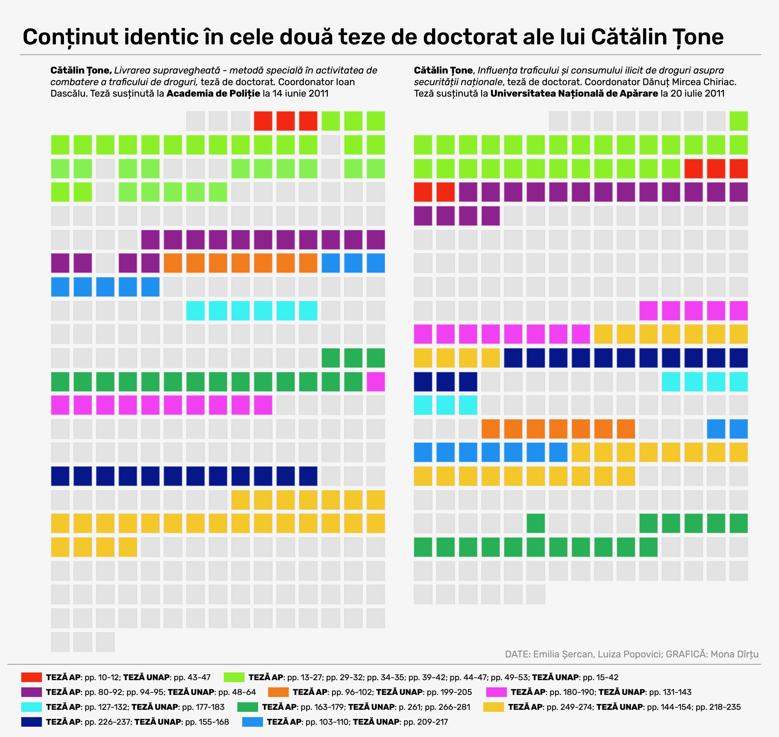 Cele două teze de doctorat ale lui Cătălin Țone includ 10 secvențe de text identic. În imagine, fiecare secvență este marcată cu o culoare diferită