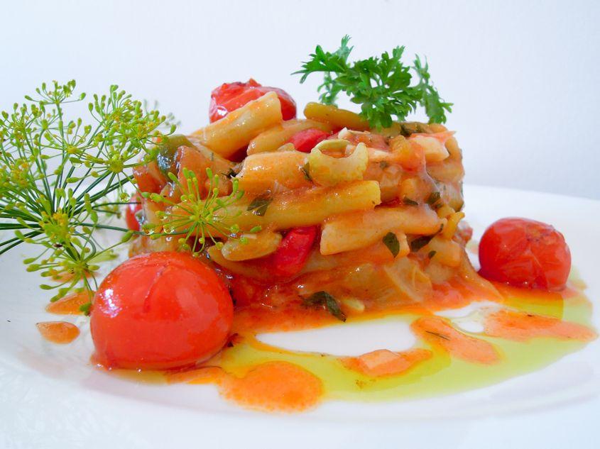 Aveți nevoie de fasole verde păstăi, ardei gras de diferite culori, roșii coapte, roșii mici, ceapă, usturoi, frunze de țelină, cimbru verde, busuioc, sare, piper, ulei.