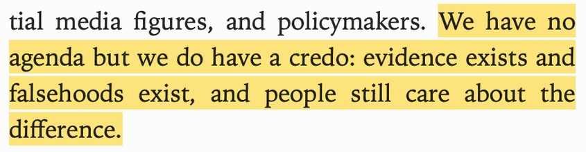 Încă din primele pagini ale cărții, scrii că nu aveți o agendă, dar aveți un crez: că dovezile există, la fel și falsurile. Și că oamenilor le pasă de diferență.