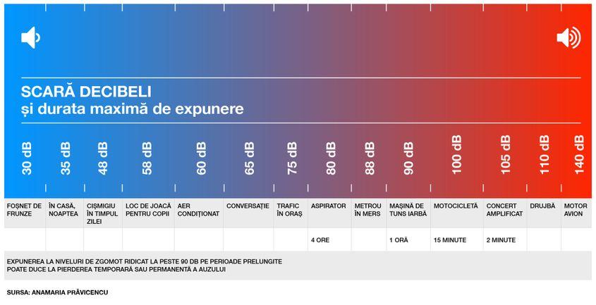 Sunt 75 de decibeli (dB), conform hărții strategice de zgomot a Primăriei, cu 20 mai mult decât cei 55 dB permiși prin lege; asta în condițiile în care la fiecare trei decibeli se dublează volumul, conform specialiștilor în poluare fonică.